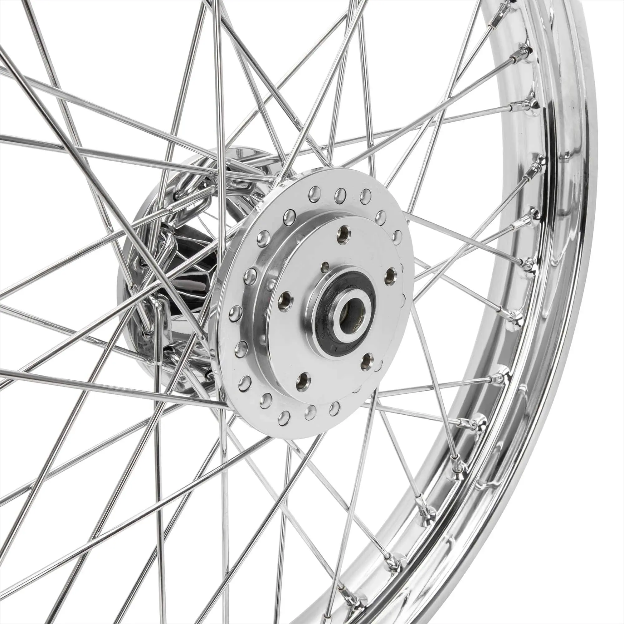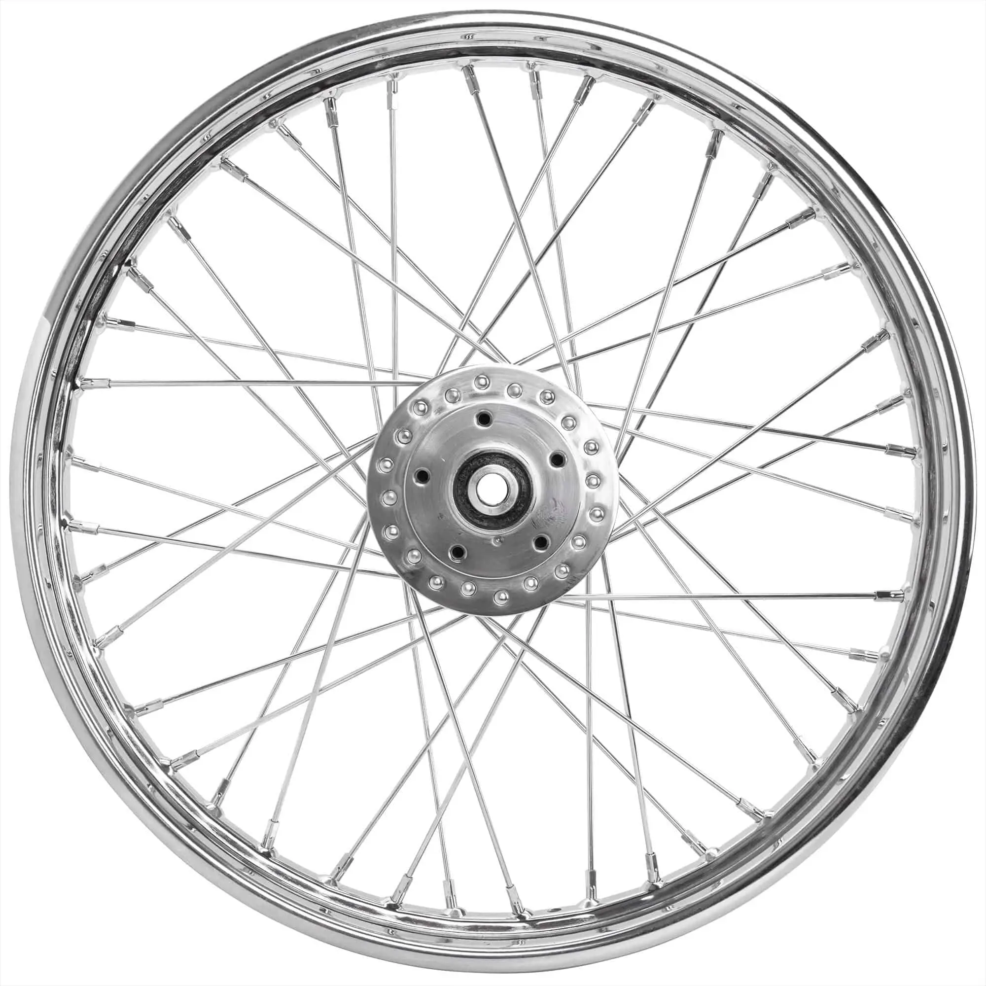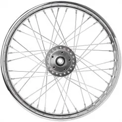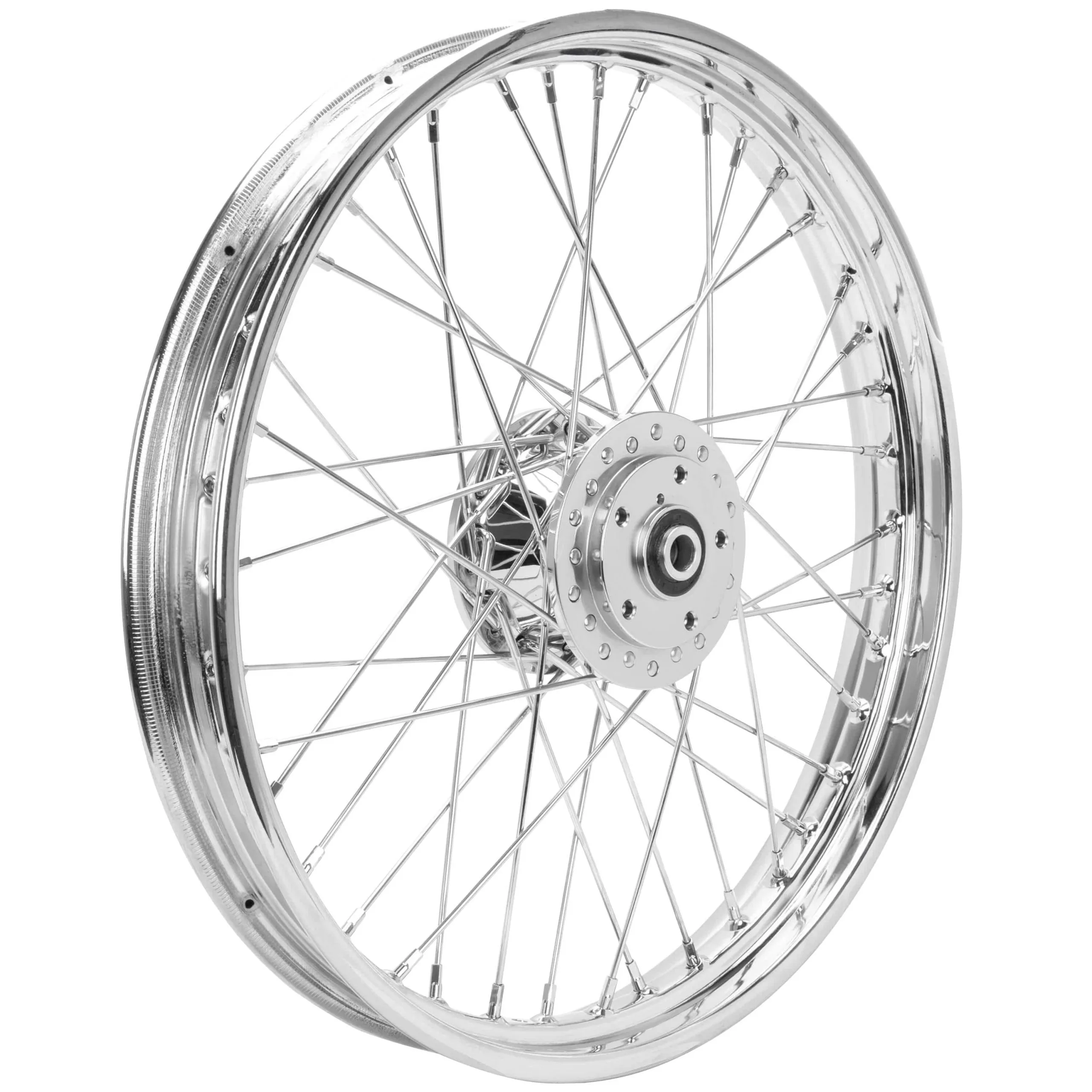 This 21 x 2.15 inch front wheel is laced, trued and ready to run! Can be used on Sportster (XL) and FX models from 1984 all the way through 1999, as well as custom applications with a 3/4 inch front axle. This is a dual flange wheel, which means it can be run as a spool wheel (no brakes) as well as single or dual rotors. These high-quality wheels feature a Harley-Davidson style drop-center steel rim, chrome spokes and tapered wheel bearings. The tapered, 3/4 inch ID (inside diameter) bearings are the same style as stock H-D for easy future maintenance. This wheel can be used to replace Harley-Davidson OEM number 43312-84 NOTE: When replacing a 19 inch wheel with a 21 inch wheel proper clearance between the spokes and the brake caliper must be verified. If the spokes and brake caliper make contact, custom shallow-back brake calipers must be used.