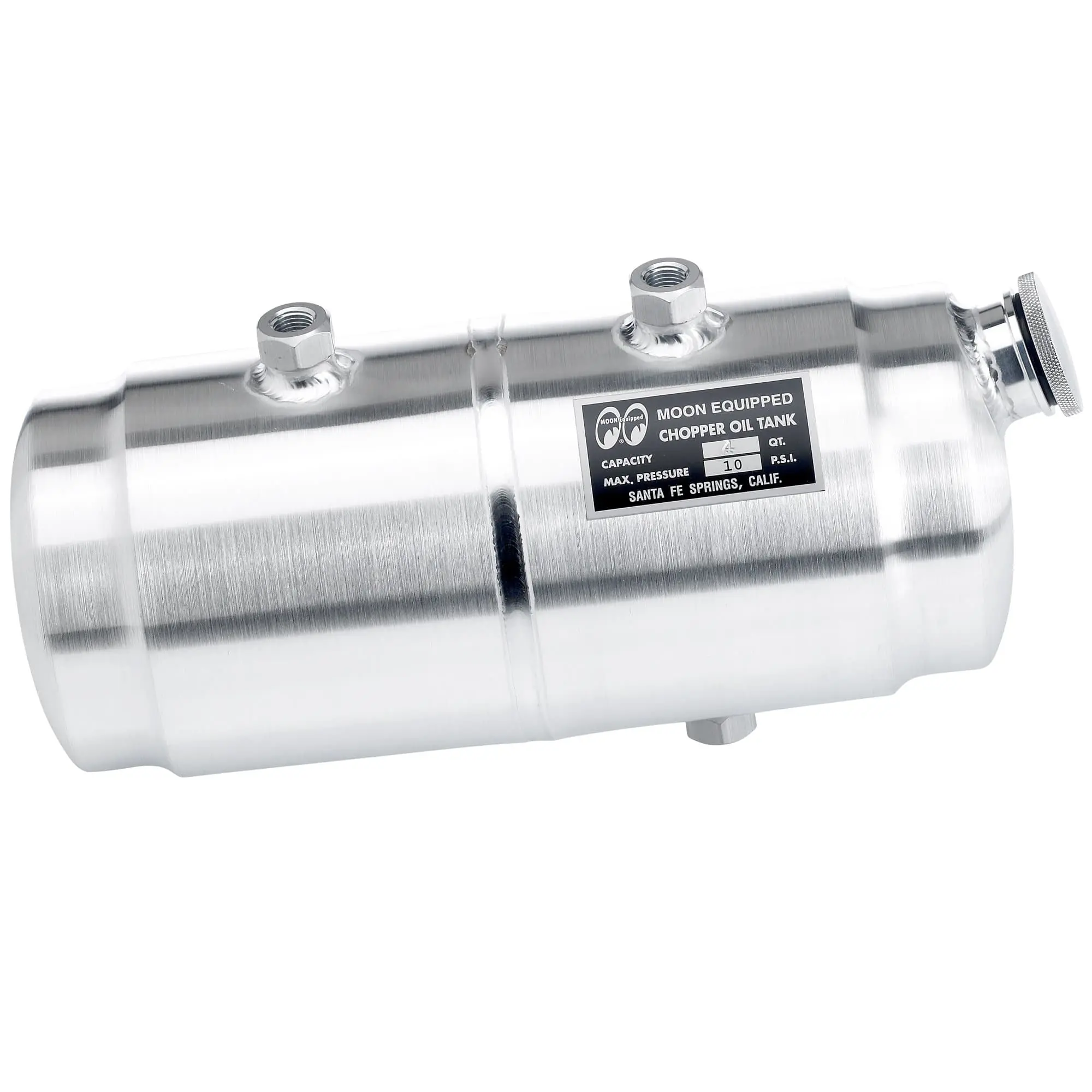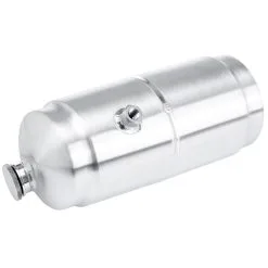 A classic spun aluminum Moon oil tank specifically made for motorcycles. This 4 quart oil tank is 5″ diameter and 12″ long. 1/4″ NPT fittings. A high-quality oil tank that will look beautiful nestled in the loins of your chopper. If this item shows as in stock, then it is on the shelf and ready to ship, no waiting! Made in the USA. Mounting brackets are not included. These Mooneyes Oil Tanks are mounted to using mounting brackets that cradle the oil tank. There are a couple of options, including the