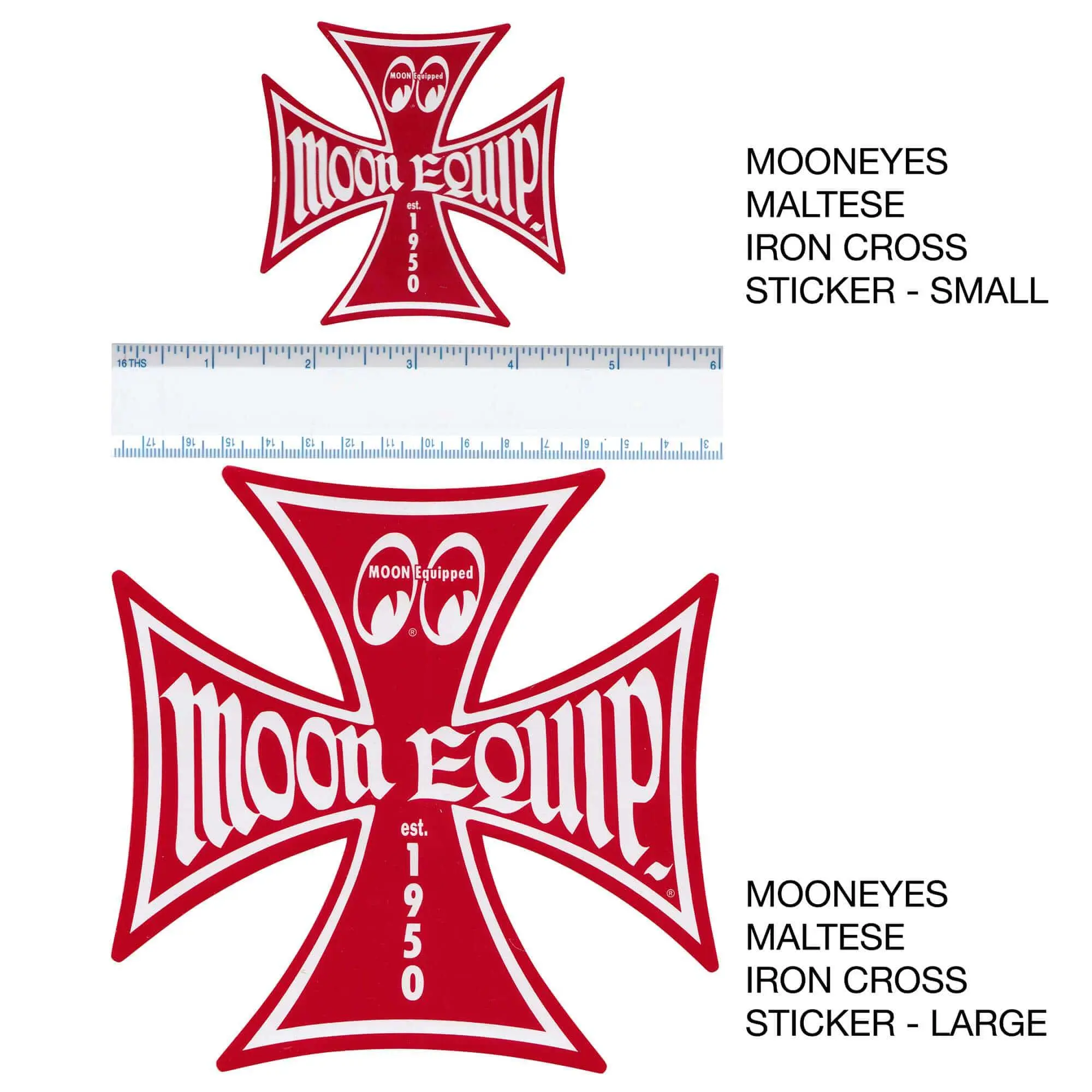 Mooneyes Equipped Maltese Iron Cross sticker/decal. Available in Red or Black, in 3″ (small), or 5″ (large) sizes.