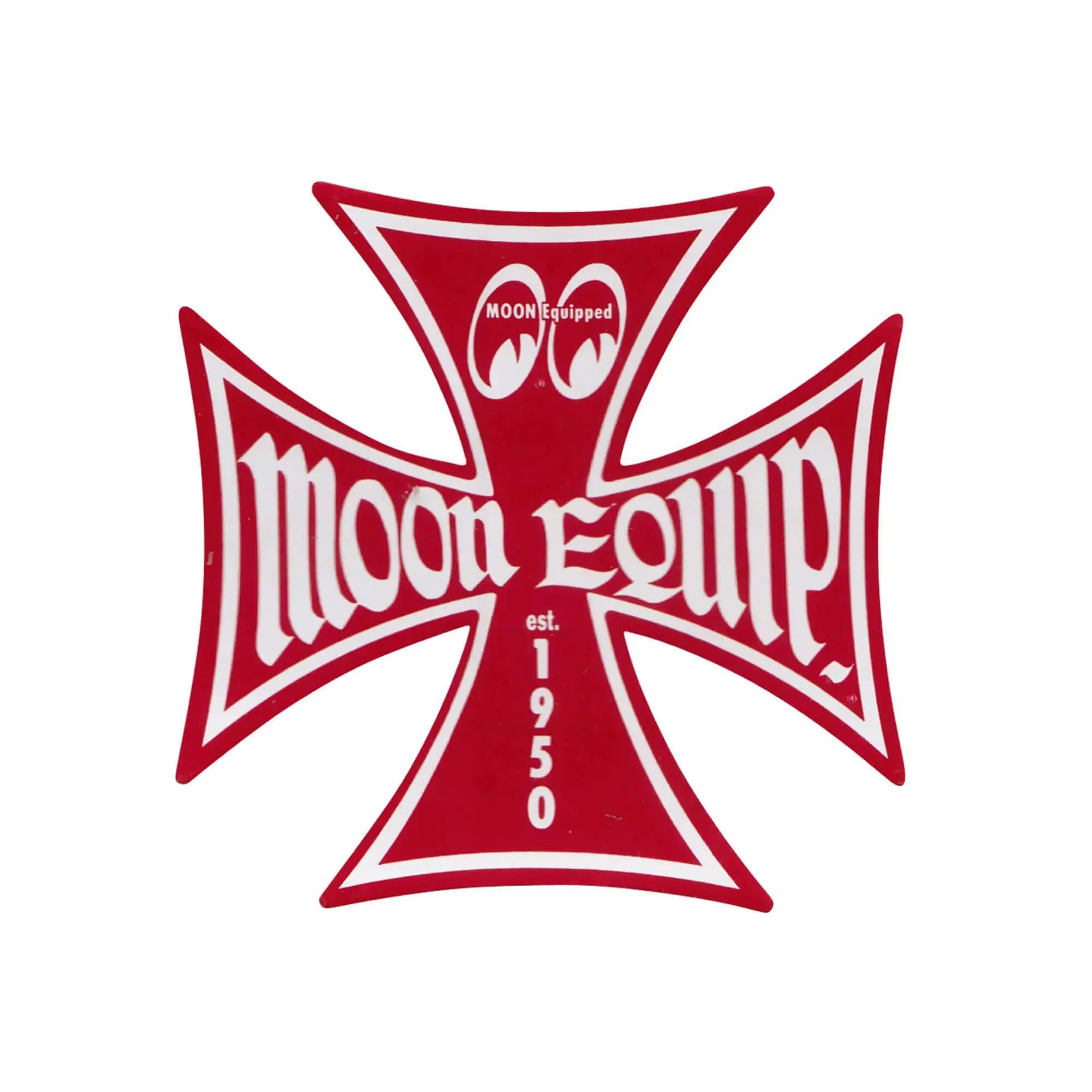 Mooneyes Equipped Maltese Iron Cross sticker/decal. Available in Red or Black, in 3″ (small), or 5″ (large) sizes.