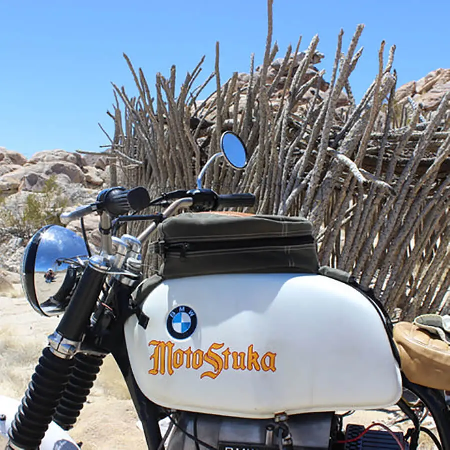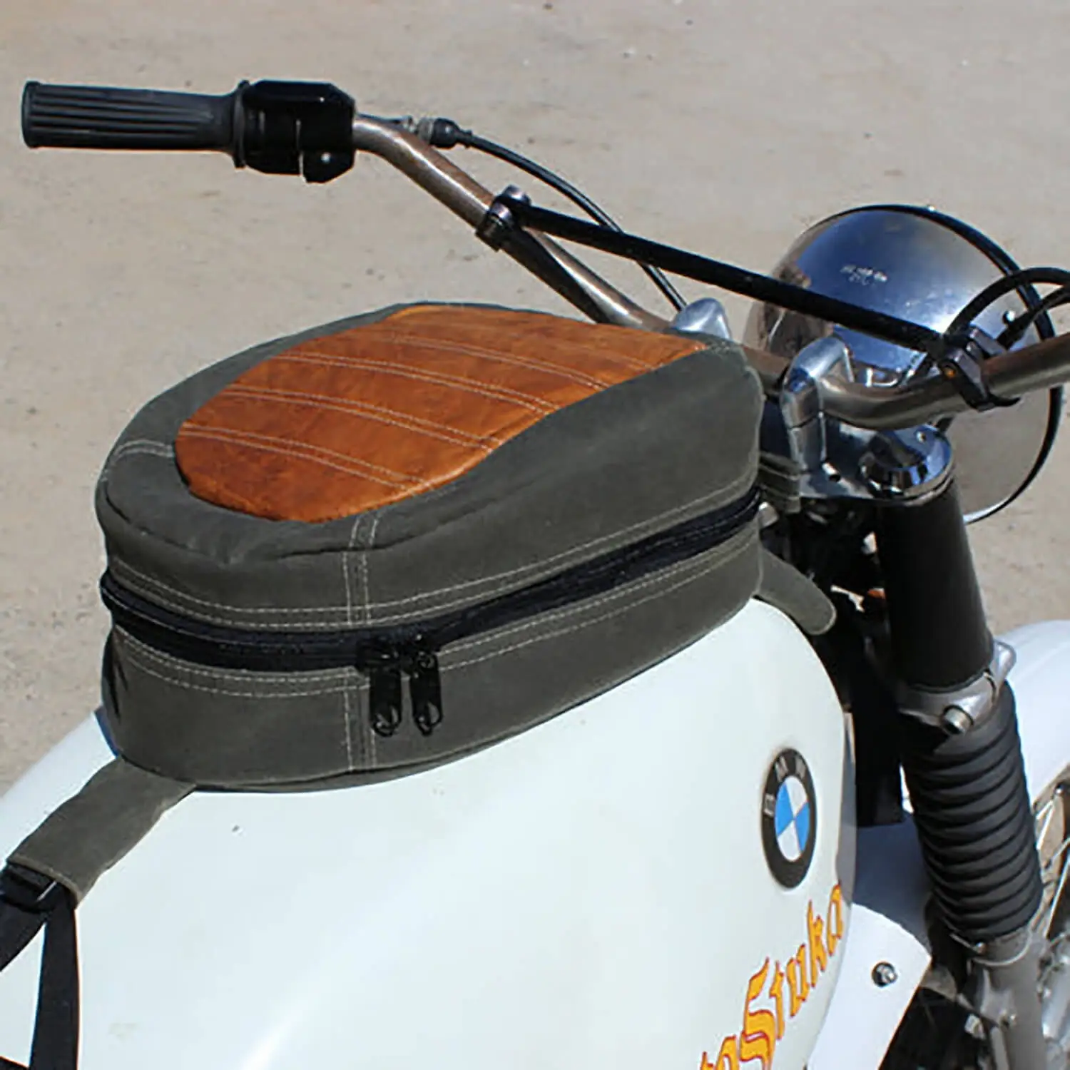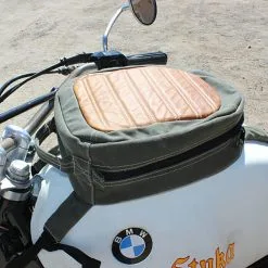 Made entirely from materials sourced in the United States, this tank bag is a unique traveling companion. The Enduro Tank Bag fixes to your bike using a snap-and-strap system, allowing it to mount to fiberglass, aluminum, and steel tanks. The snap-and-strap system is covered so it won’t scratch your tank. The tank bag is padded and insulated, perfect for carrying tools, your phone, camera, or whatever you need to enhance your time on the road! We hand-distress the leather ourselves, giving it the unique vintage shine that people around the world have come to love.
