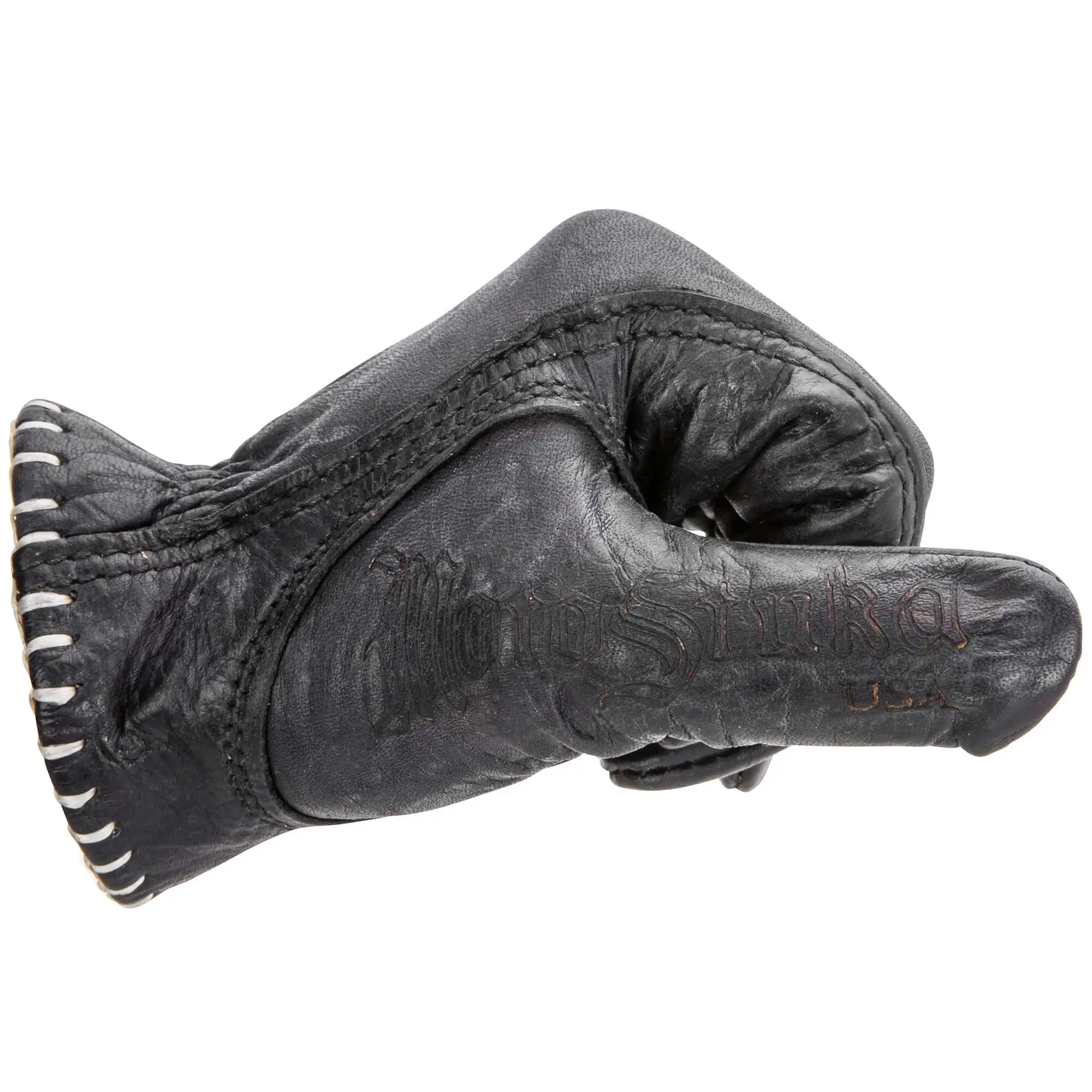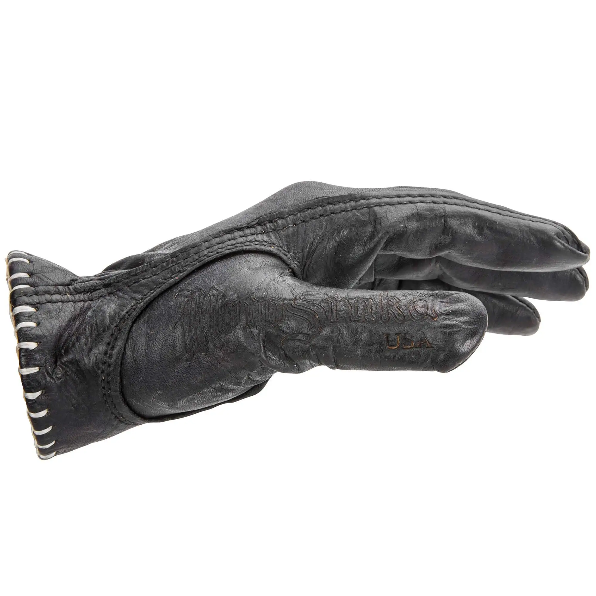 MotoStuka is a company founded on principles rare in today’s throw away culture. Their products represent a dedication to simple, elegant design, high quality materials, and an obsession with time honored craftsmanship. From the “ME23 Gigante” Tool Roll to the “Hog Butcher” shop aprons, MotoStuka accessories are designed using their hearts as well as their heads. Shanks start out as high quality cow hide gloves. At the MotoStuka studio, they undergo the “treatment”. “Shanked” and finished out with waxed thread, they’re then conditioned with a balm made of locally sourced beeswax, natural oils, and distilled tree spirits. This age-old recipe waterproofs the leather and gives it a distressed rich copper finish. The process is dynamic and unpredictable so every glove is unique in color and feel, but ALL get more beautiful with every mile! Shanks are available in Medium, Large, and Extra Large.
