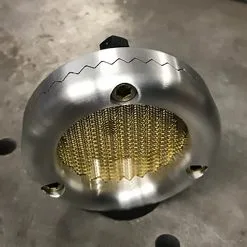 This 6061-T6 aluminum cover locks in a brass mesh screen saving the bees while still allowing adequate flow. Fits super E & G carbs and includes mounting hardware. Test ran for a year on a 80″ shovelhead. Spun 400 finish ( 400 grit ) has a semi polish look that matches the E and G carbs nicely. Measures 3.25″ in diameter by 15/16″ thick.  Made in the USA.