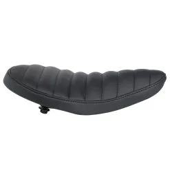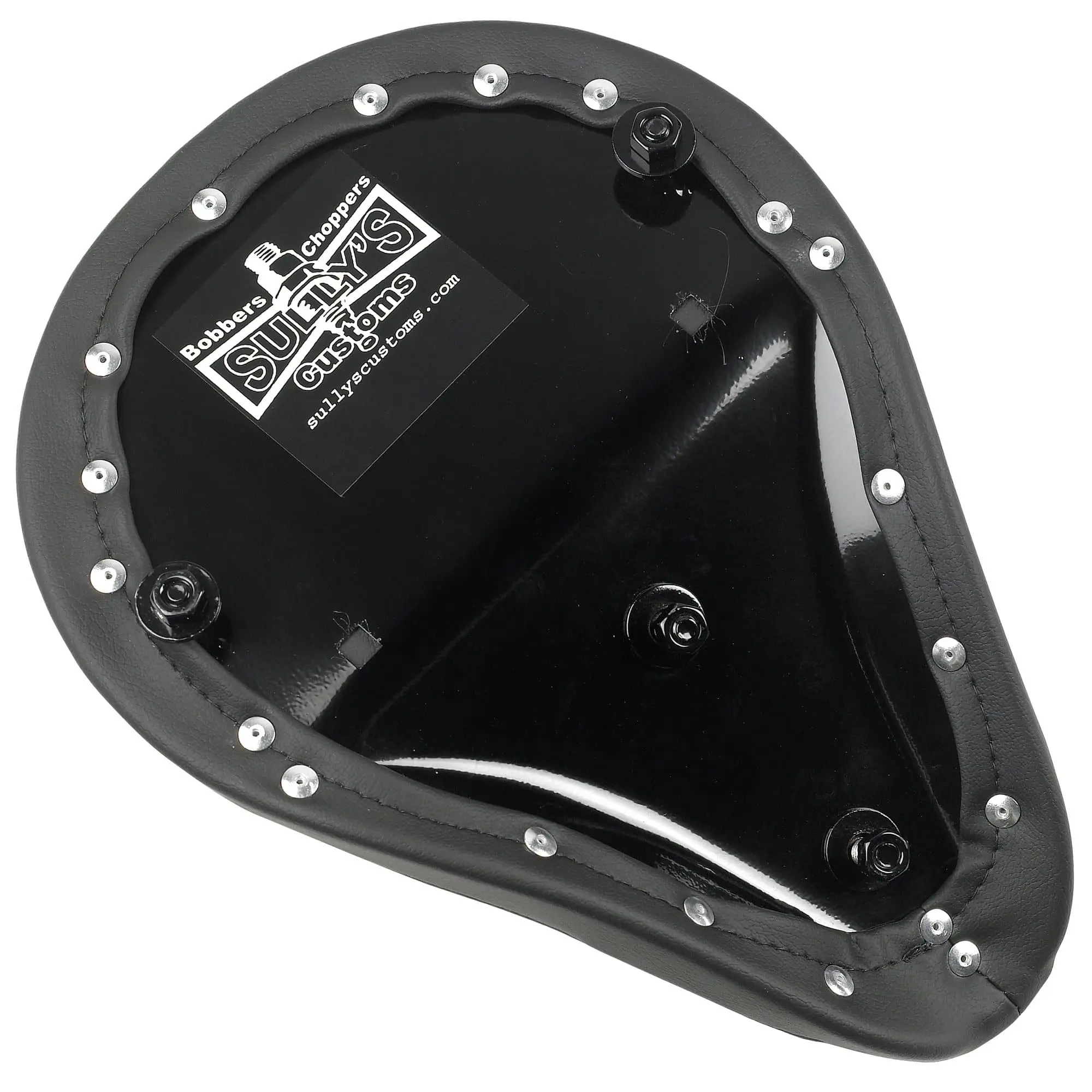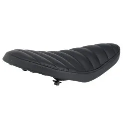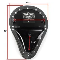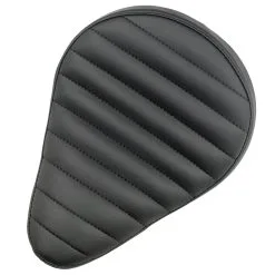 This Horizontal Pleated (tuck and roll) pattern solo seat is 9-1/2″ wide by 13″ long, a perfect fit for that lane-splitter your are building. These seats are USA made start-to-finish in Centerville, Indiana at Sully’s Customs. Steel pan and hardware, with black powdercoated finish, 3/4″ foam and a high-quality naugahyde cover.