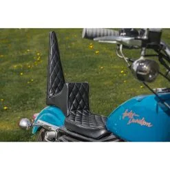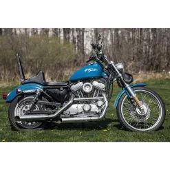 This vintage style custom seat will fit 1982 through 2003 Harley Davidson Sportsters using the stock mounting holes. These seats are made of a more traditional looking Vinyl for a Vintage Look of the 60’s or 70’s and the seat features an internal sissy bar for your passenger to lean back on without the use of an external sissy bar. Made to exacting high standards by the folks at Sully’s Customs. Made in the USA.