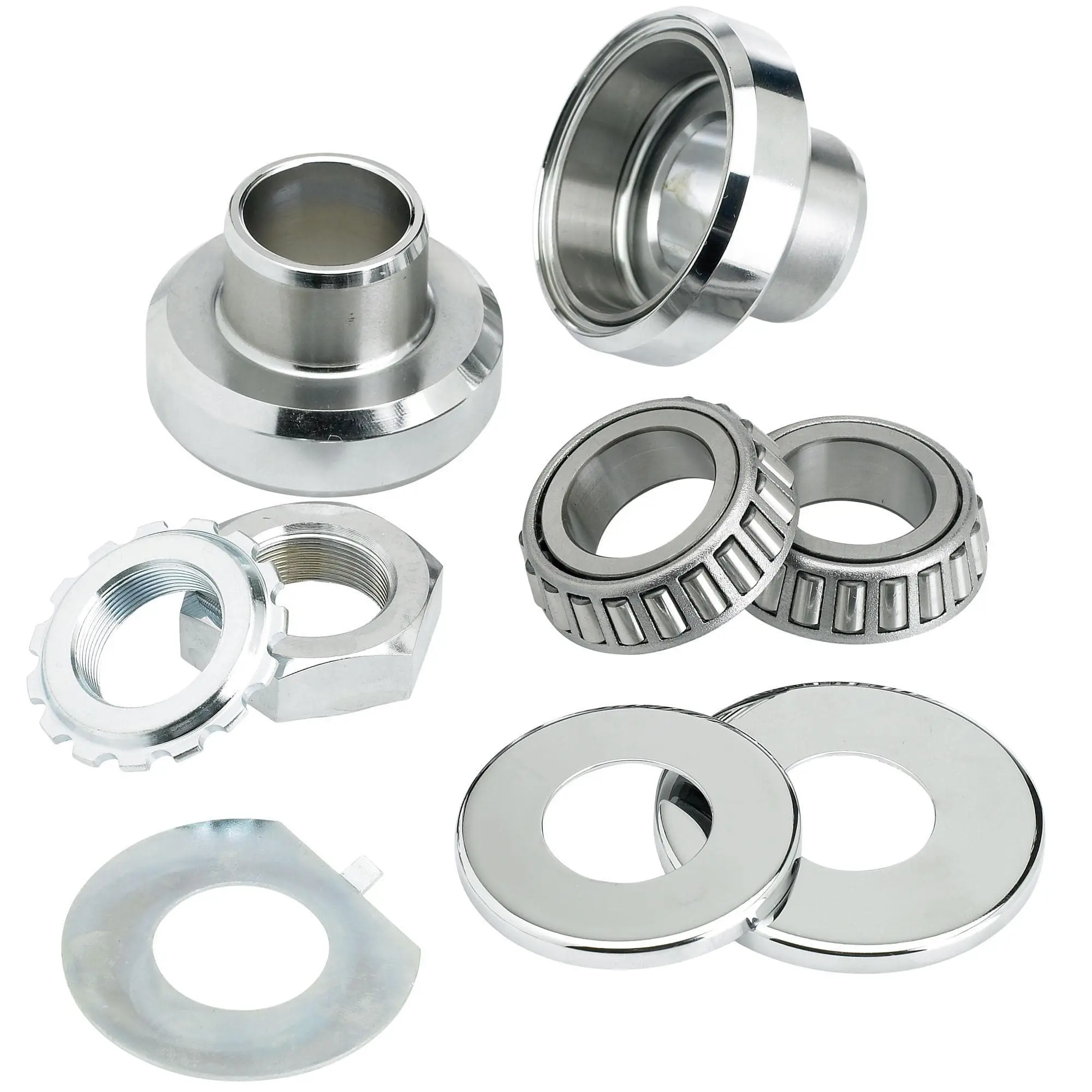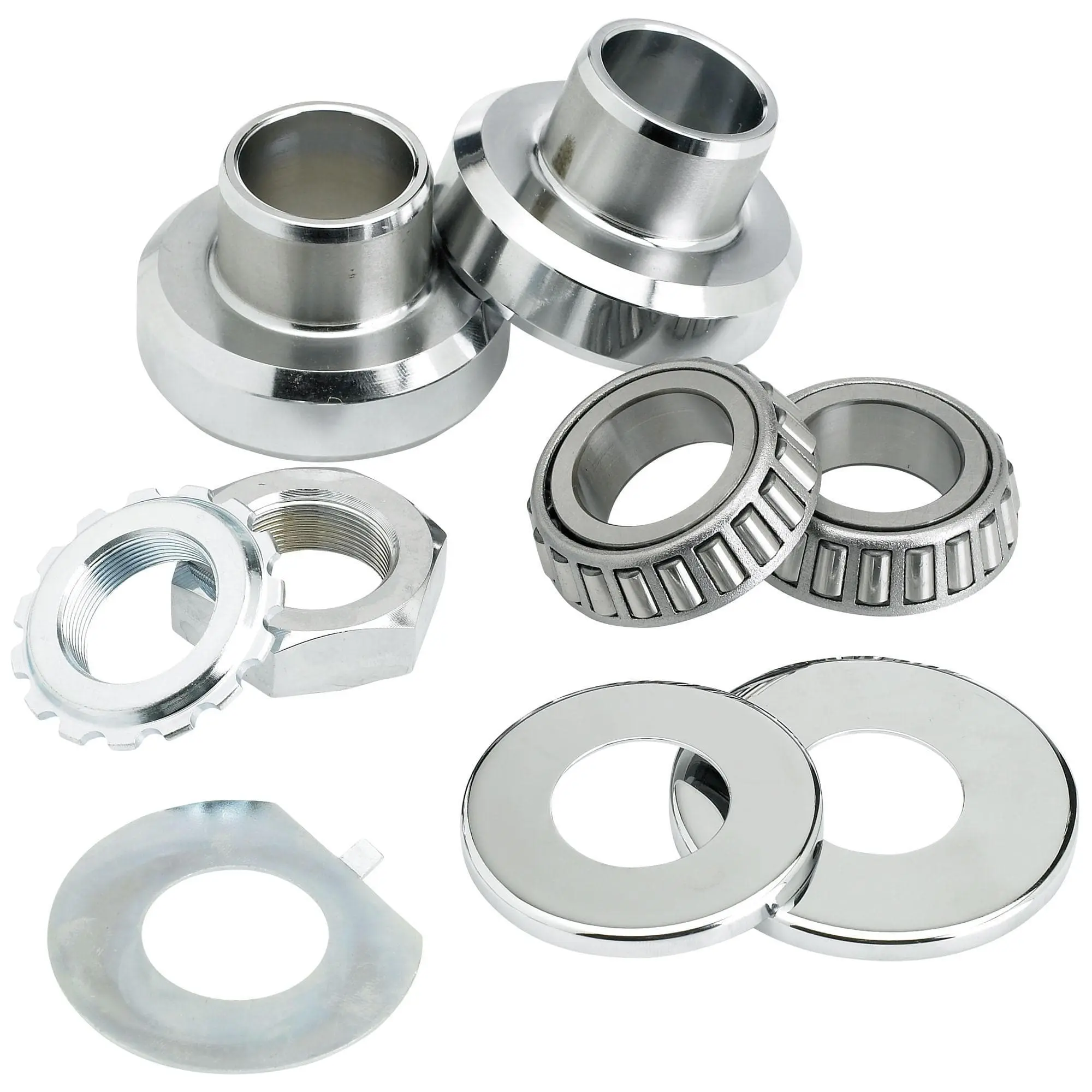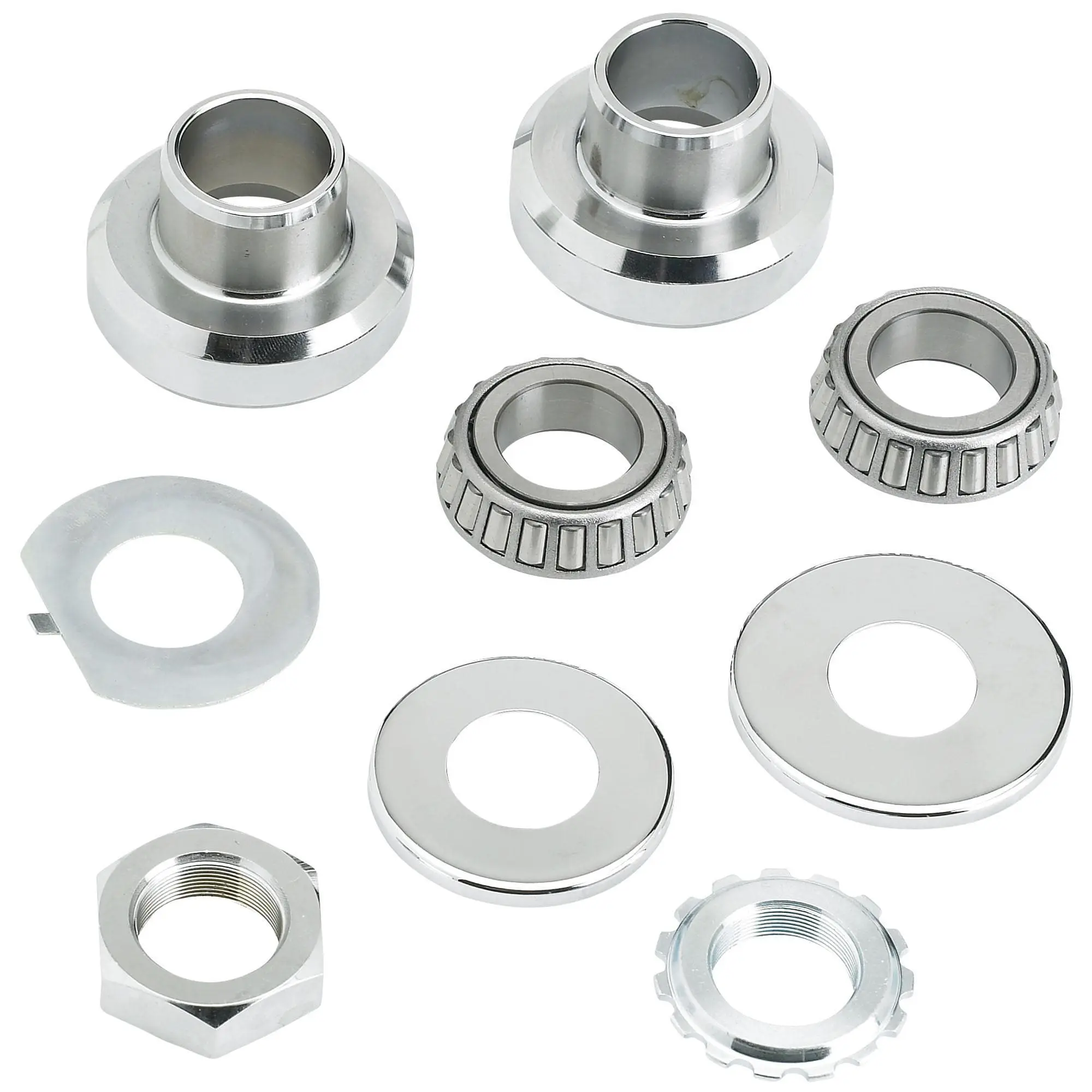 This fork neck cup kit includes two chrome neck cups, two bearings, dust cover set, cone cover nut, stem nut and lock washer. Stock fitment for the following Harley-Davidson motorcycles: